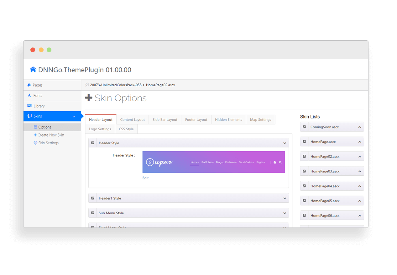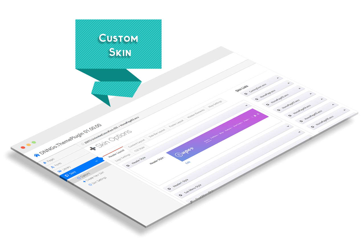The ThemePlugin includes these options: Customize Header Layout, Content Layout, Footer Layout, hide/display skin elements, Skin Lists and Create New Skin etc.